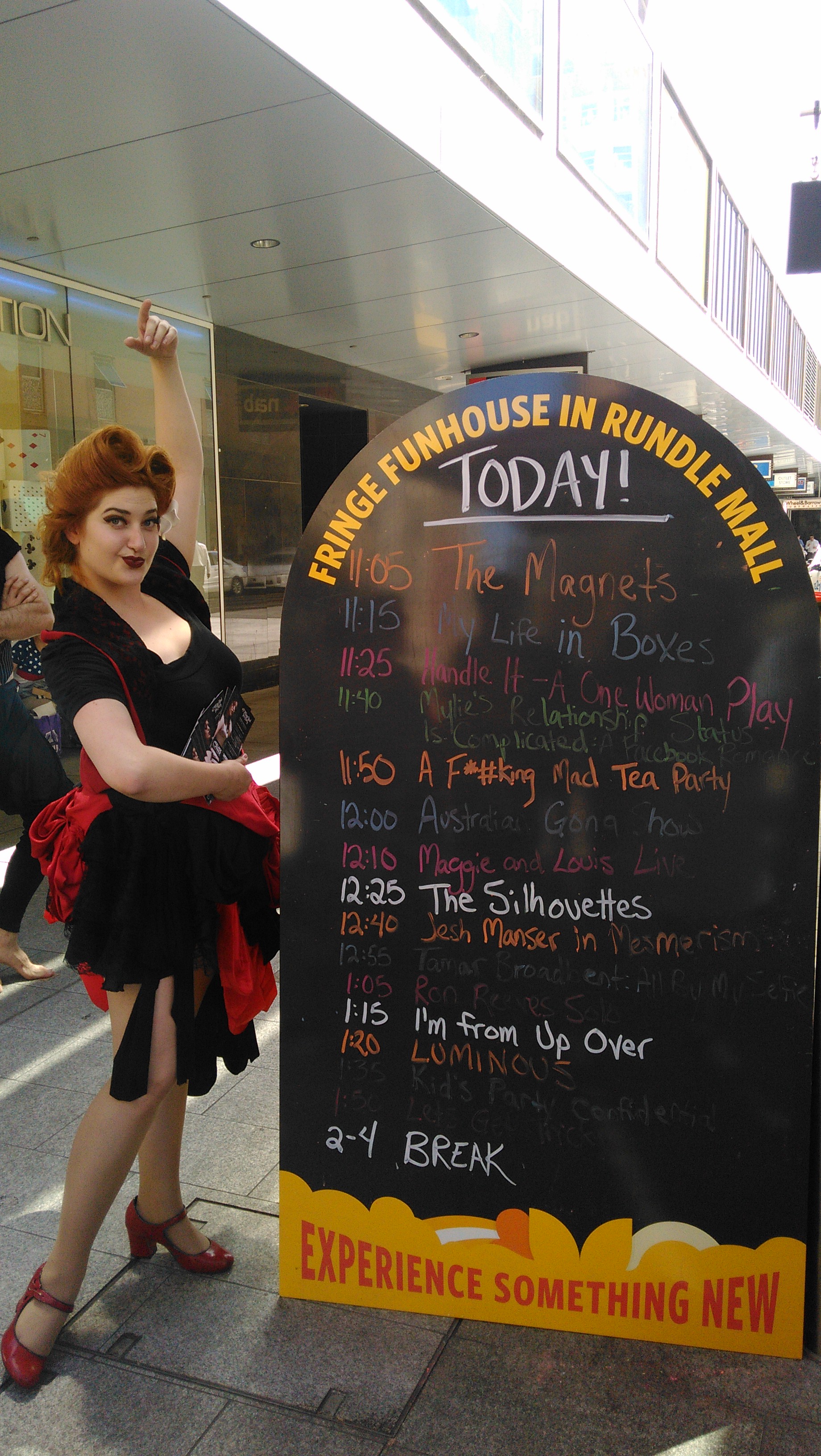 Another fantastic opportunity we had throughout the week was performing at the Fringe Funhouse set up at Rundle Mall. This was a great opportunity to let people know about our show, but also meet some lovely people! We did quick ten minute spots on Monday, Tuesday and Wednesday, and luckily some audience members captured some highlights.